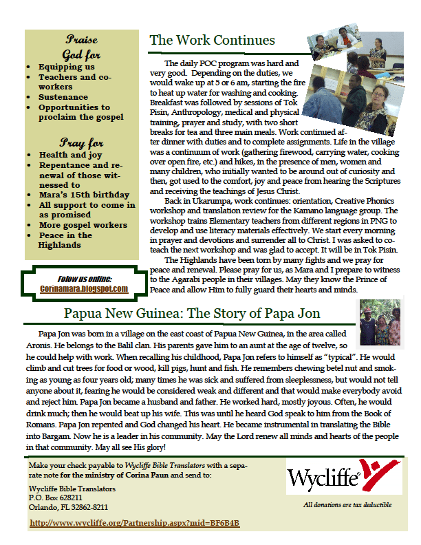 Mai jos este o scrisoare de rugaciune si prezentare a lucrarii de misiune a surorii Corina Paun in Papua Noua Guinee, prin organizatia Wicliffe. Ea este fica fratelui Cristache Paun din biserica pe care o pastoresc. Experienta sorei Corina este una de genul William Carey, sau Hudson Tyler, merg intr-o zona complet neevanghelizata, invata limba si obiceiurile locului, apoi incearca pe orice cale sa ii conduca la Hristos. Zona aceea este fara cunostinta de Hristos. Conditiile sunt aprige, din punct de vedere fizic, cat si din punct de vedere cultural. Satele in care face misiune sunt specifice triburilor africane: traiesc din ceea ce da padurea (radacini de copaci, plante si vietati specifice zonei).