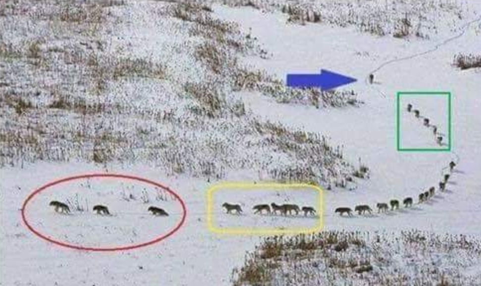 Lupii când merg în haită sunt organizați într-un mod foarte strategic și înțelept. Primii trei sunt lupii bătrâni și înțelepți, ei sunt prevăzători și cunoscători. Merg primii!